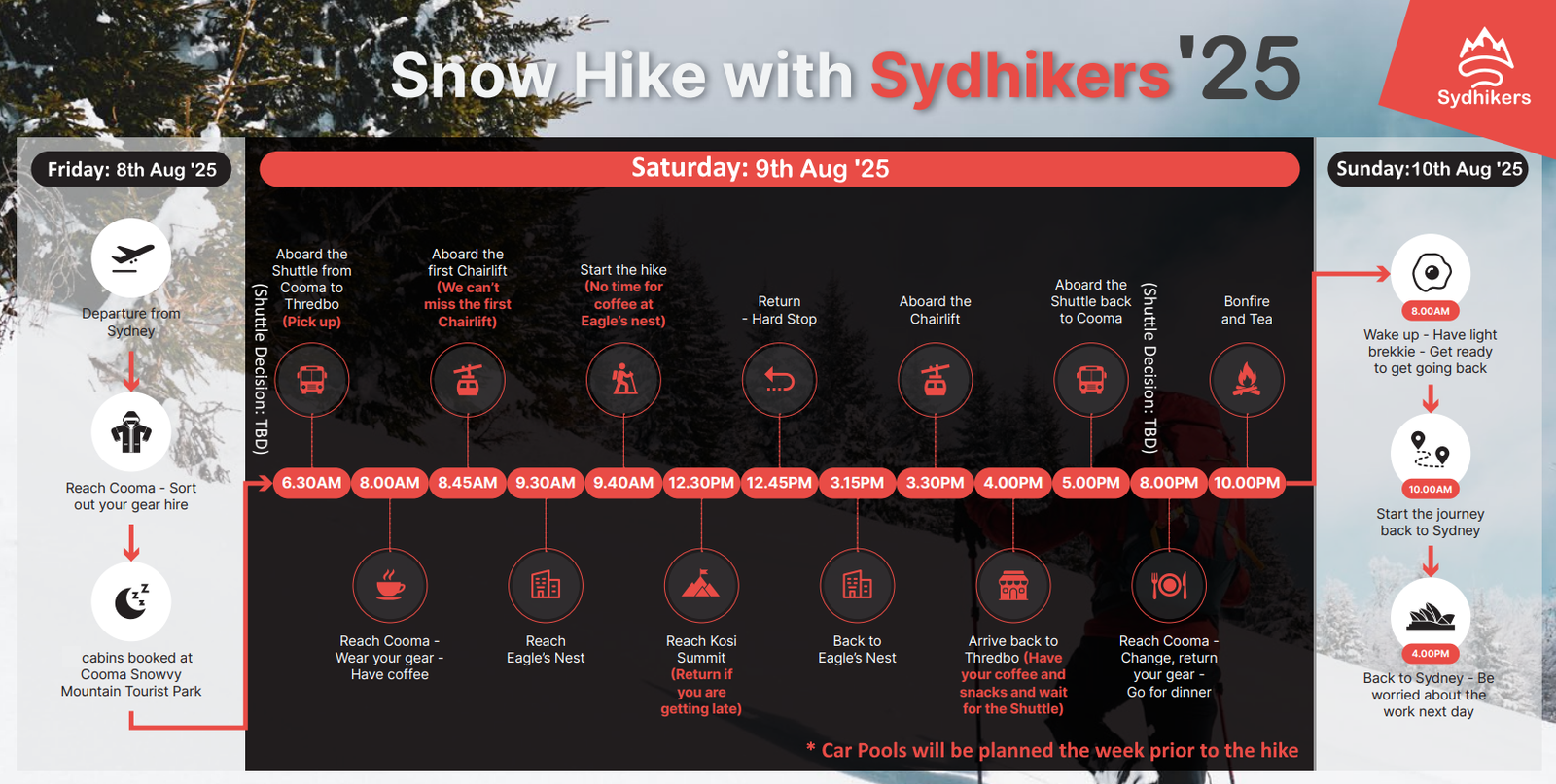 Car Pooling from Sydney to Cooma will be planned later next week.
